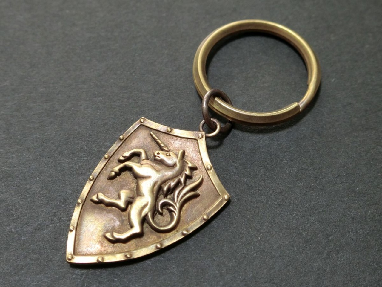 盾のキーリングです。ユニコーンのレリーフを張り付けてあります。真鍮製。