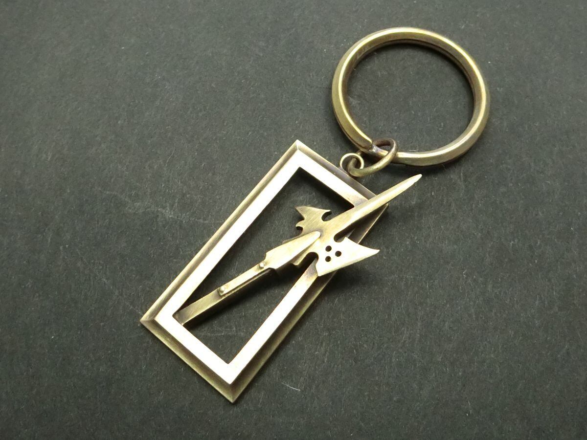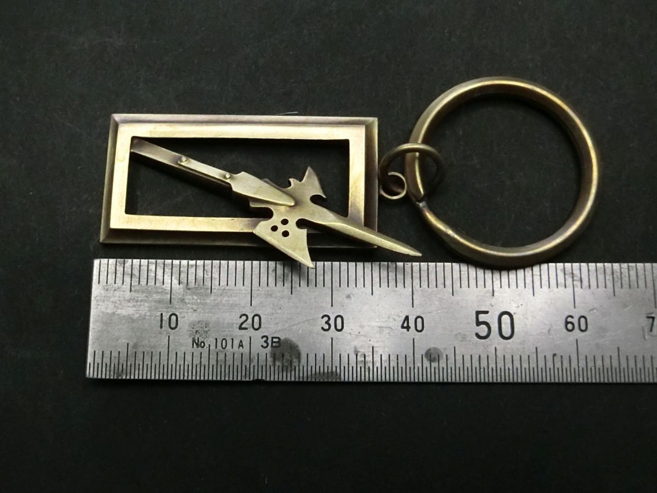 ハルベルトが枠からはみ出しているデザインのキーリングです。真鍮製。